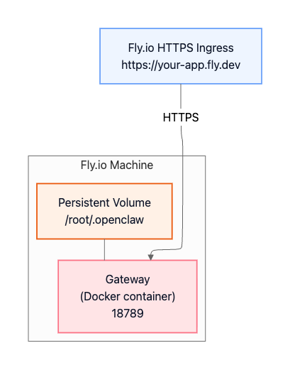 Fly.io is a cloud-native deployment option where the Gateway runs in a Docker container managed by Fly.io. A persistent volume stores OpenClaw state (configuration, sessions, credentials) so it survives deploys and restarts. Fly.io provides a managed HTTPS endpoint (with TLS termination) in front of the container, making the Gateway reachable remotely over the public internet.