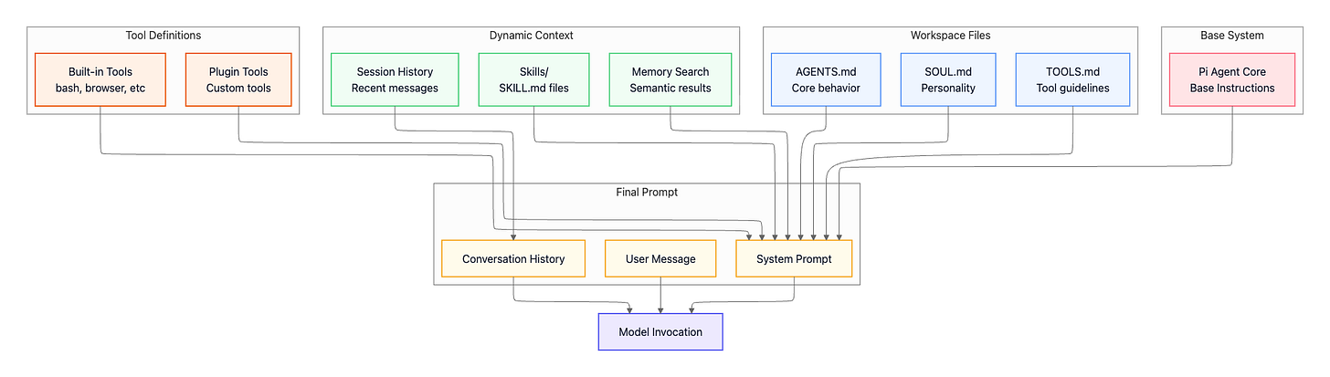 All these elements combine into the final system prompt, which is sent to the model along with conversation history and the current user message. This composable approach means you can change agent behavior, style, and task competence by editing files in the workspace, without touching source code, while keeping execution, permissions, and sandboxing enforced by the runtime.