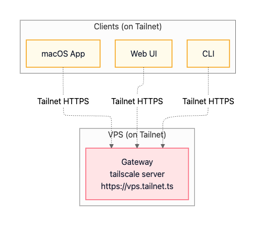 Tailscale offers an alternative approach for VPS deployments. Instead of maintaining an SSH tunnel, you join both your VPS and your client devices to the same Tailscale network (a “tailnet”). The VPS uses Tailscale Serve to expose the Gateway via HTTPS to other devices on the tailnet (for example, https://vps.tailnet.ts). This provides encrypted access without managing SSH keys or tunnel processes.