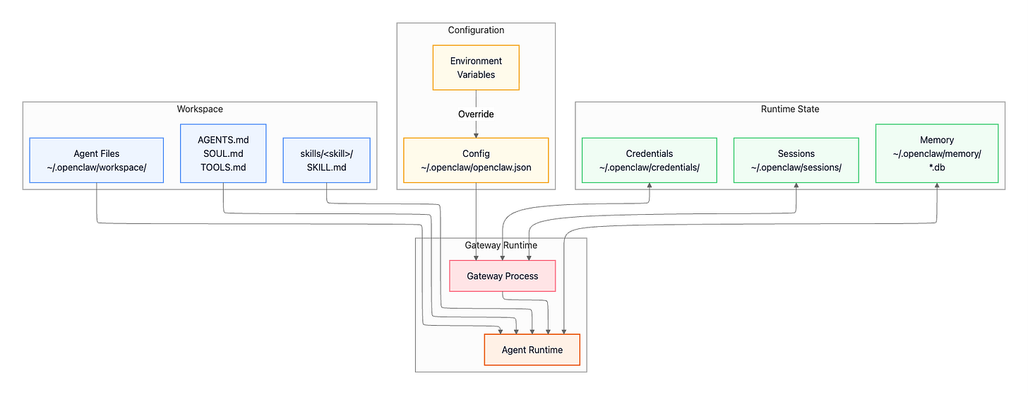 Sensitive authentication data goes in ~/.openclaw/credentials/. This includes channel authentication tokens like WhatsApp’s session data, OAuth credentials for platforms like Discord, and any other secrets needed for channel access. File permissions are restricted to 0600 (owner read/write only), and the directory is automatically excluded from version control to prevent accidental leaks.