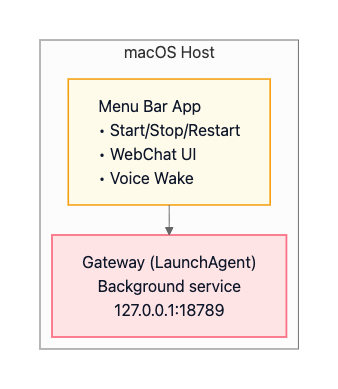 The macOS production deployment uses a LaunchAgent to run the Gateway as a background service. The service auto-starts on login and remains running continuously. The macOS menu bar app provides a native interface for starting, stopping, and restarting the Gateway. It includes WebChat UI embedded directly in the app, Voice Wake functionality for hands-free operation, and local access through the loopback interface. Remote access is possible via SSH tunnels or Tailscale.