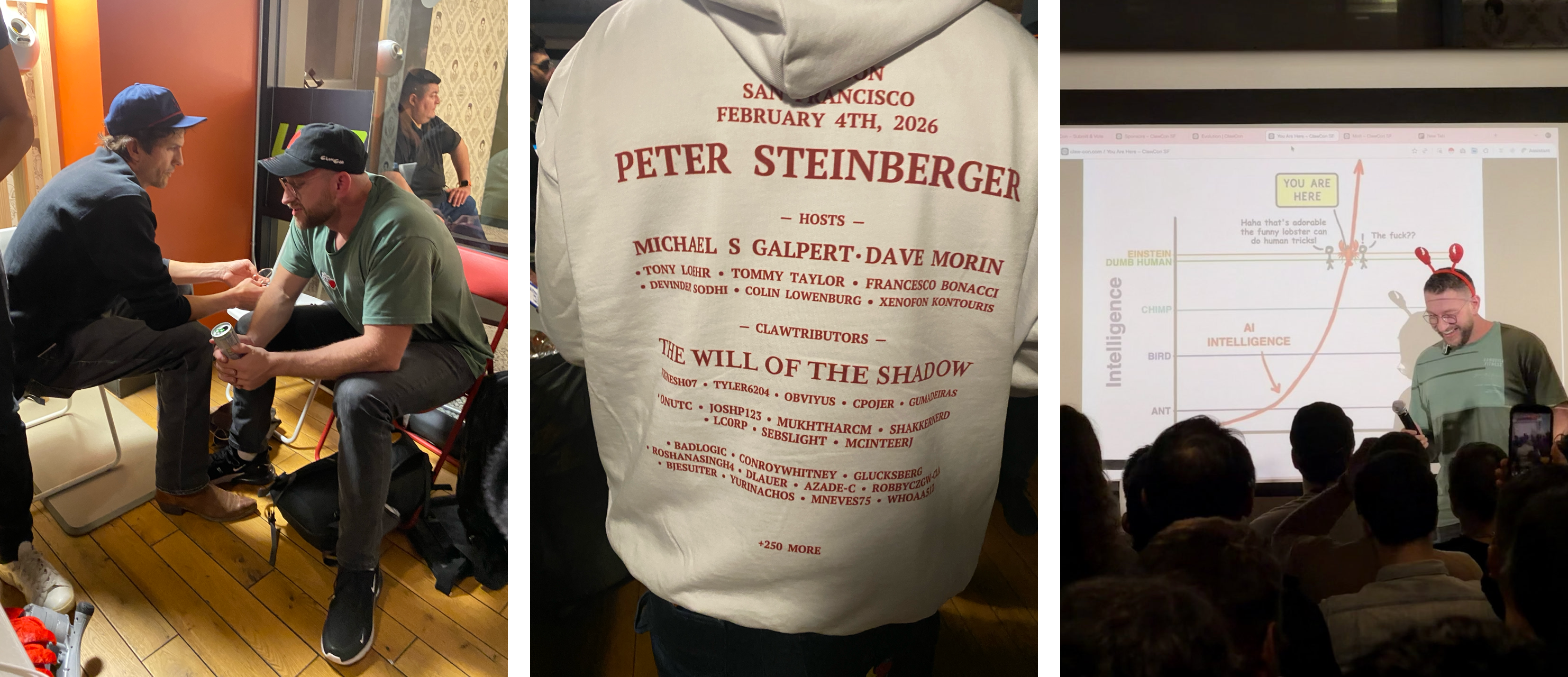Just a few weeks later, on February 5th, Michael Galpert and Dave Morin organized the third event in the series, now rebranded as ClawCon, the 1st OpenClaw SF Show & Tell. Over 700 people showed up. The energy was electric. Investors like Ashton Kutcher spent nearly an hour having people pitch him projects. Peter Steinberger, the creator of OpenClaw, was the true Hollywood-like star of the night, with everyone surrounding him for questions, congratulations and selfies.