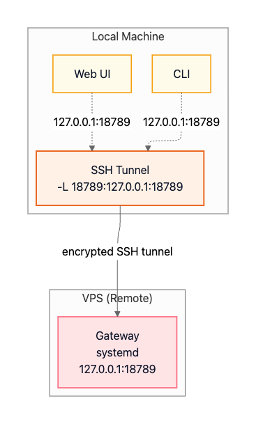 ssh -N -L 18789:127.0.0.1:18789 user@vpsOnce the tunnel is established, your local CLI and Web UI connect to 127.0.0.1:18789 on your machine, and traffic is transparently forwarded through the encrypted SSH tunnel to the remote Gateway: