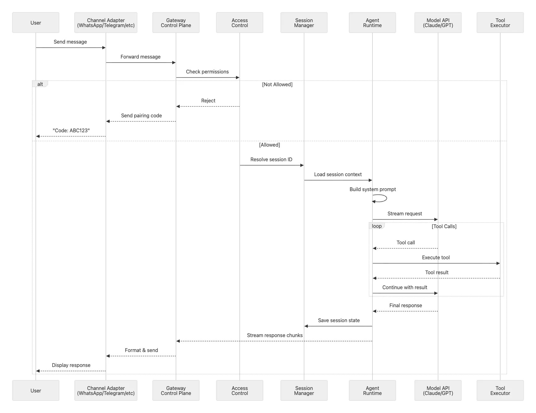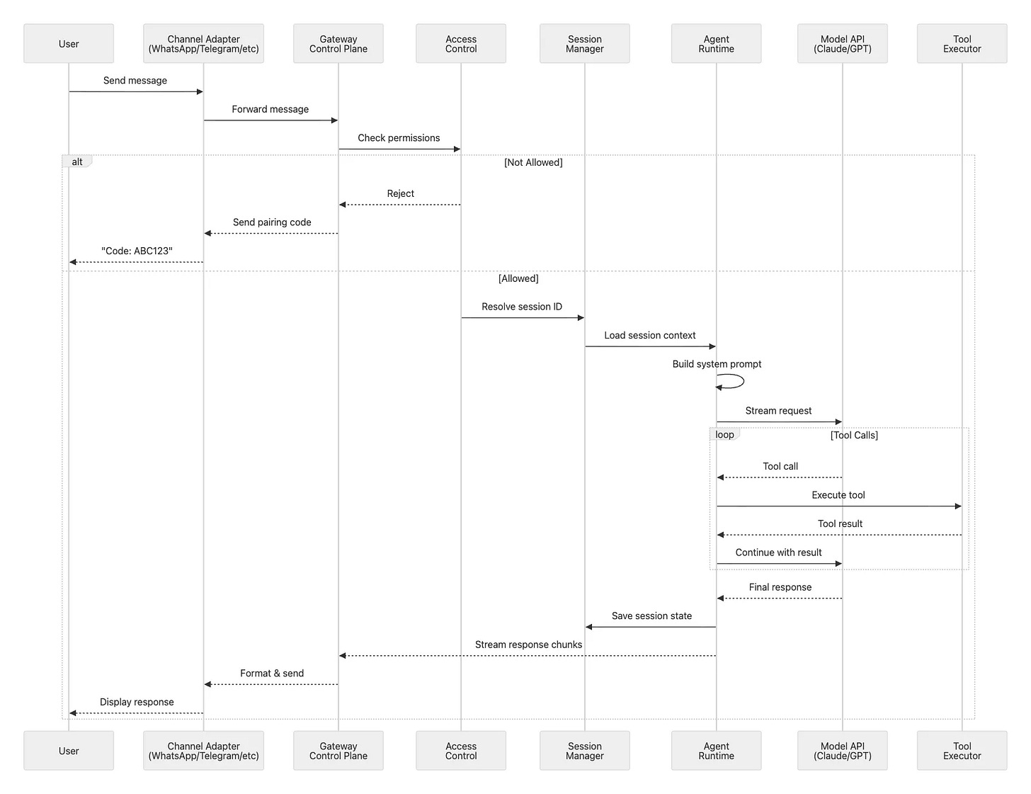 Every messaging platform (WhatsApp via the Baileys library, Telegram through grammY, Discord using discord.js) connects through this central point. CLI tools, the web UI, and mobile apps all connect as WebSocket clients. When an inbound message arrives, the Gateway routes it through access control checks, resolves which session should handle it, and dispatches it to the appropriate agent. It coordinates system state including sessions, presence indicators, health monitoring, and cron jobs. And crucially, it enforces security through token or password authentication for any non-loopback bindings and implements a pairing system for direct messages.