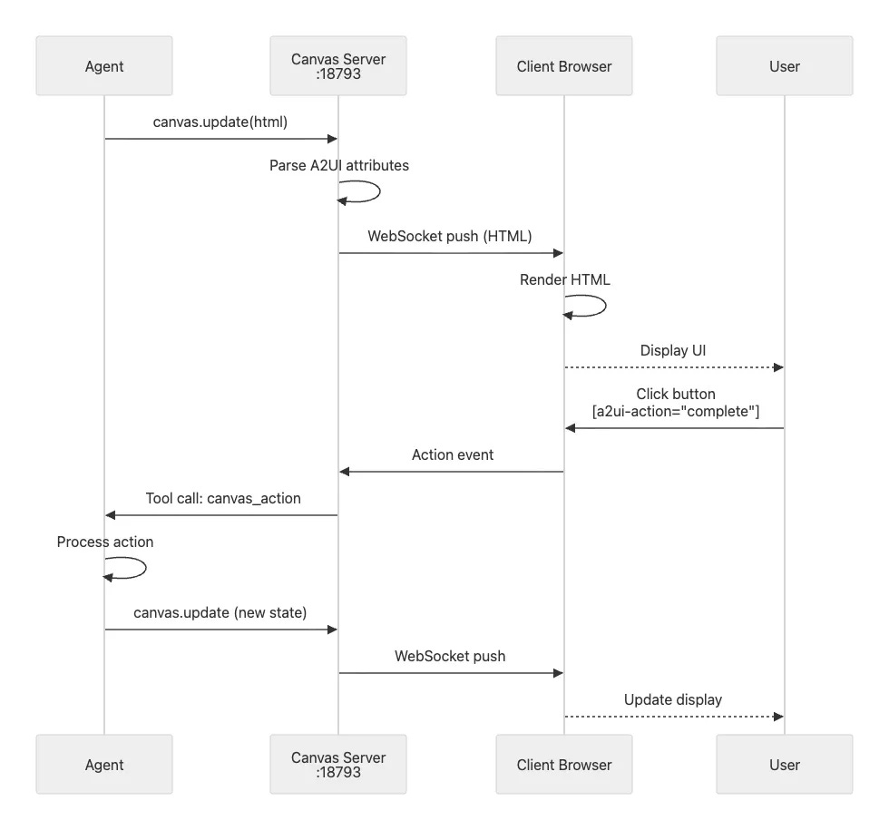 The flow works like this: the agent calls a canvas update method, the Canvas server receives the HTML and parses any A2UI attributes embedded in it, the server pushes this content over WebSocket to connected browser clients, and the client renders the HTML as an interactive interface.